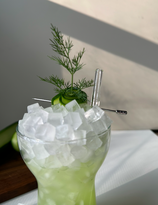 This is a crisp and refreshing mocktail that brings together the cool, clean flavors of fresh cucumber juice and the herbal aroma of dill.