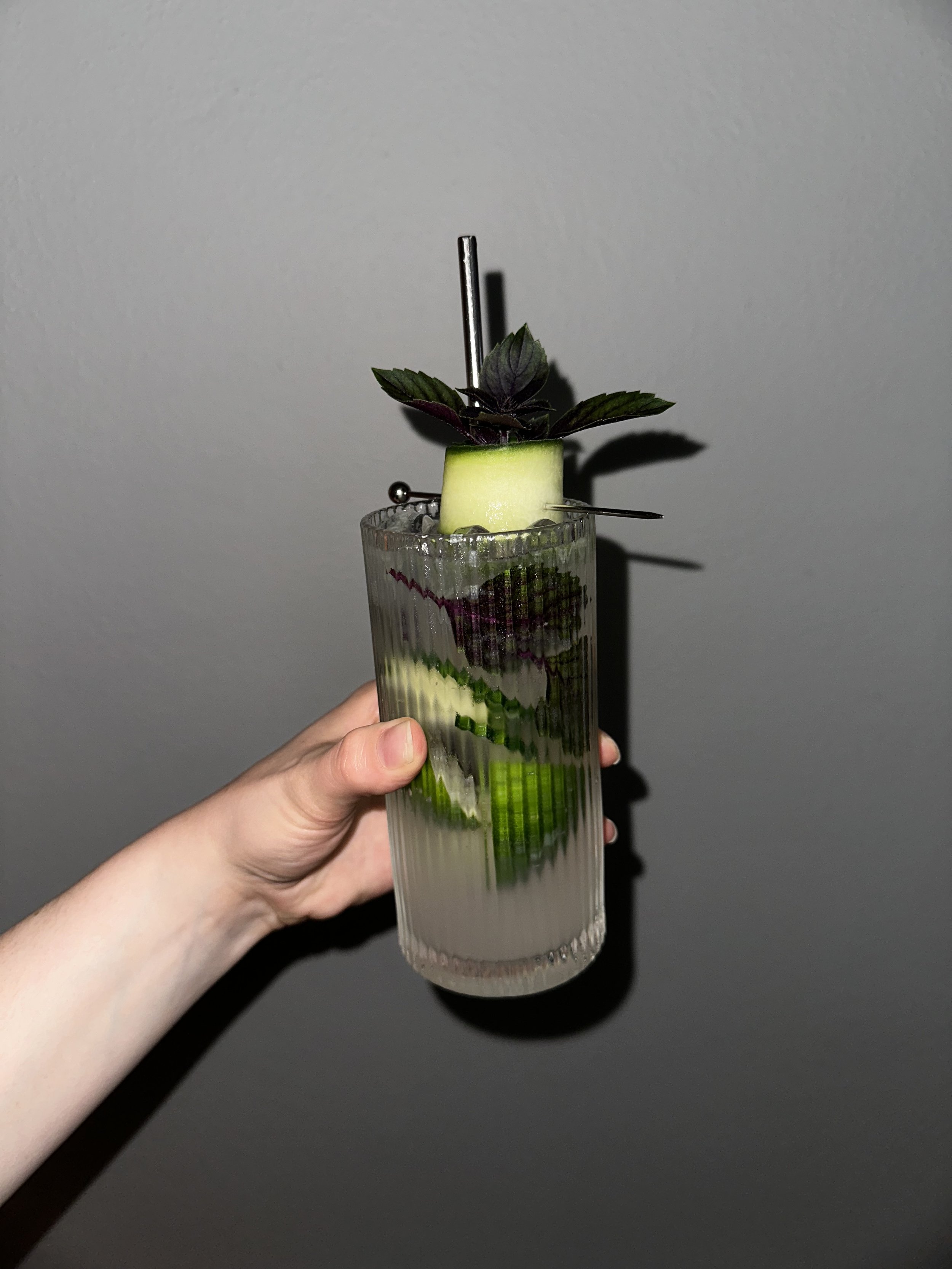 Combine lime pieces in a highball glass and muddle until juice is expressed. Add cucumber slices and basil and gently muddle a second time. Add tonic syrup, gin and ice, and stir until cold and combined. Top with Soda water and gently stir a final time to combine. Garnish with ribbon and basil sprig!
